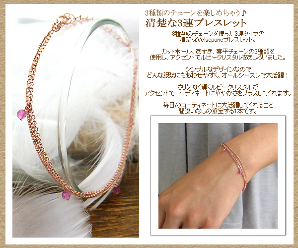 3種類のチェーンを使った3連タイプの清楚なVelsepone(ベルセポーネ)ブレスレット。カットボール、あずき、喜平チェーンの3種類を使用し、アクセントでルビークリスタルをあしらいました。シンプルなデザインなのでどんな服装にもあわせやすく、オールシーズンで大活躍!さり気なく輝くルビークリスタルがアクセントでコーディネートに華やかさをプラスしてくれます。毎日のコーディネートに大活躍してくれること間違いなしの重宝する1本です。
