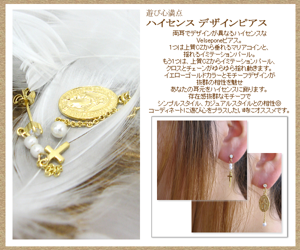 両耳でデザインが異なるハイセンスなVelsepone(ベルセポーネ)ピアス。1つは上質キュービックジルコニアから垂れるマリアコインと、揺れるイミテーションパール。もう1つは、上質キュービックジルコニアからイミテーションパール、クロスとチェーンがゆらゆら揺れ動きます。イエローゴールドカラーとモチーフデザインが抜群の相性を魅せあなたの耳元をハイセンスに飾ります。存在感抜群なモチーフでシンプルスタイル、カジュアルスタイルとの相性◎コーディネートに遊び心をプラスしたい時にオススメです。お揃いのブレスもあるので、合わせて使えばオシャレ度UP↑