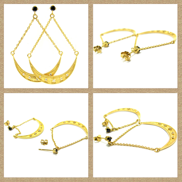 シャンデリアの様な三日月の様な、、、耳元に強烈なインパクトを与えてくれるVelsepone(ベルセポーネ)ピアス。チェーンで繋がれたチャームがゆらゆら揺れ動き耳元をパッと華やかに飾ってくれます。さり気なく上質キュービックジルコニアをあしらいゴージャス感をプラス。今までにない大ぶりなサイズ感のものをセレクトすることで全身の装いスタイルにも新鮮な動きが加わりコーディネートの幅がひろがります。リゾートスタイルとの相性抜群ですが、普段スタイルから、キチンとした装いスタイルまで様々なコーディネートに合わせて頂けます。