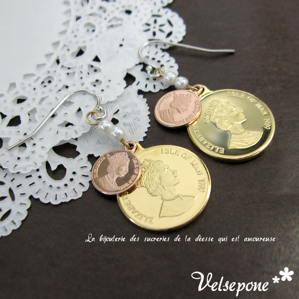 エリザベス女王のコインが大小ダブルチャームになっているVelsepone(ベルセポーネ)ピアス。イミテーションパールから垂れる大小2つのコインがインパクト大!耳元にハイセンスな存在感を与えてくれます。シンプルスタイル、カジュアルスタイルとの相性◎