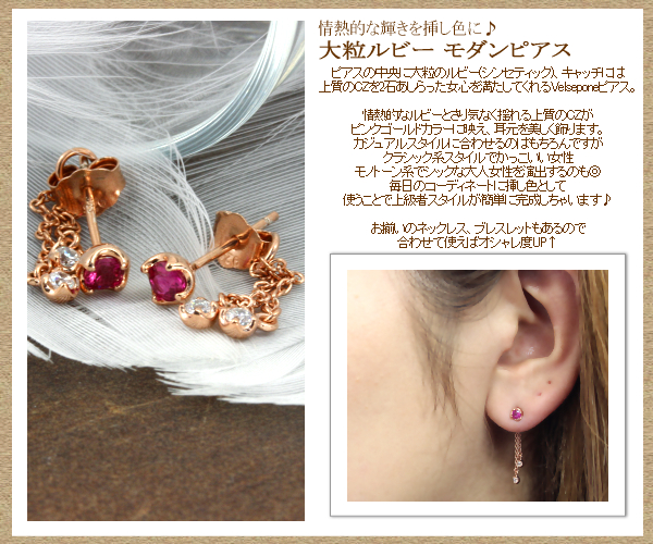 ピアスの中央に大粒のルビー(シンセティック)、キャッチには上質のキュービックジルコニアを2石あしらった女心を満たしてくれるVelsepone(ベルセポーネ)ピアス。情熱的なルビーとさり気なく揺れる上質のキュービックジルコニアがピンクゴールドカラーに映え、耳元を美しく飾ります。カジュアルスタイルに合わせるのはもちろんですが、クラシック系スタイルでかっこいい女性、モノトーン系でシックな大人女性を演出するのも◎毎日のコーディネートに挿し色として使うことで上級者スタイルが簡単に完成しちゃいます♪お揃いのネックレス、ブレスレットもあるので、合わせて使えばオシャレ度UP↑