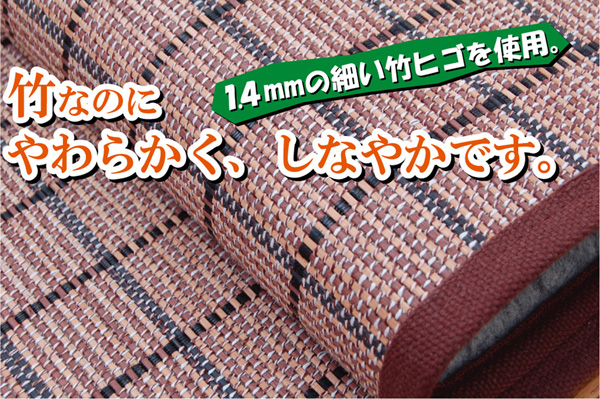 素材は1.4mmの細ヒゴを使用しています。竹は耐久性に優れ、熱伝導率が高いため、自然のひんやり感があります。竹を細ヒゴにすることで、硬いイメージの竹がやわらかく、しなやかになります。またクッション性に特にこだわり、中材にはウレタン13mmを使用しています。プニプニとした柔らかい感触とボリューム感を是非お楽しみ下さい。縦糸にカラー糸を使用し柄を出したモダンなカラーのデザイン織りです。裏には不織布を貼っていますので、フローリングでのご使用にも最適です。竹は他の木材と比べると格段に成長が早く(3〜5年で成竹)、持続的生産が可能な環境に優しいサスティナブルな素材です。