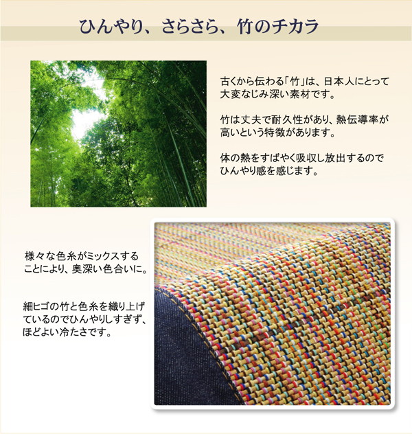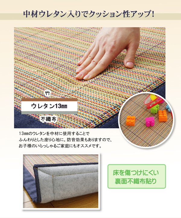 カラフルな糸を使用しデザインを出した竹ラグです。中材にはウレタンフォームを13mm使用し、ボリュームのあるふっくらとしたふみ心地に仕上げました。竹らしい質感とシンプルで家具とも合いやすいデザインのラグです。竹は他の木材と比べると格段に成長が早く(3〜5年で成竹)、持続的生産が可能な環境に優しいサスティナブルな素材です。