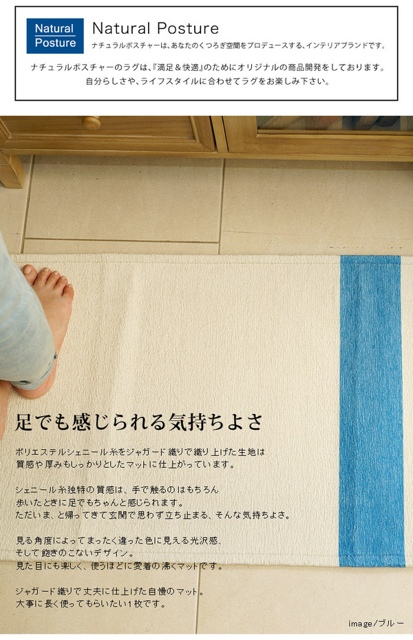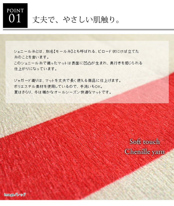 手触りの柔らかなシェニール糸と、耐久性の高いジャガード織りのラグ。