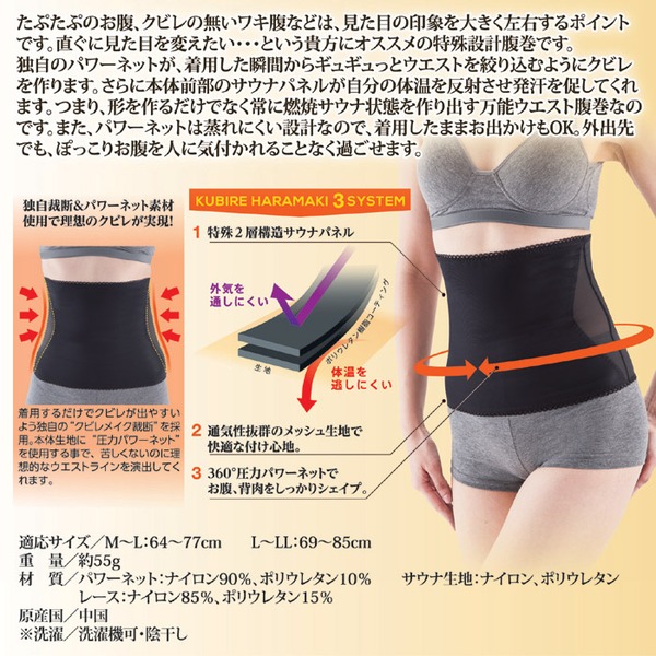 ●蒸れにくいのでお出かけにそのまま着用、いつでもバーニング! たぷたぷのお腹、クビレの無いワキ腹などは、見た目の印象を大きく左右するポイントです。直ぐに見た目を変えたい・・・という貴方にオススメの特殊設計腹巻です。独自のパワーネットは、着用した瞬間からギュギュっとウエストを絞り込むようにクビレを作ります。さらに本体前部のサウナパネルが自分の体温を反射させ発汗を促してくれます。つまり、形を作るだけでなく常に燃焼サウナ状態を作り出す万能ウエスト腹巻なのです。また、パワーネットは蒸れにくい設計なので、着用したままお出かけもOK。外出先でも、ぽっこりお腹を人に気付かれることなく過ごせます。